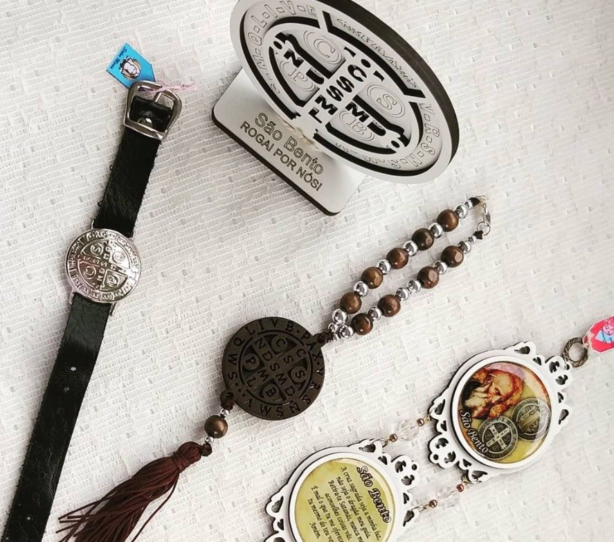 Kit 05: pulseira, dezena de carro, mdf cruz sagrada e pêndulo são bento: 51,00