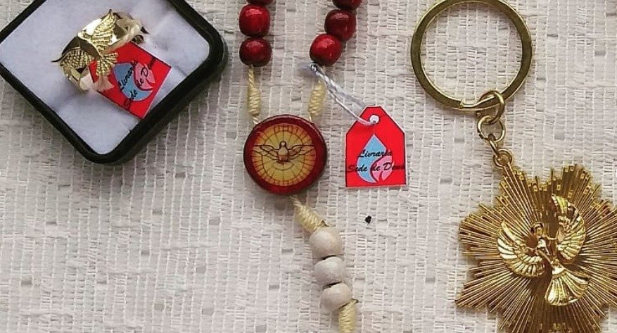 Kit 20: Terço do Espírito Santo + Chaveiro do Espírito Santo + Pêndulo do Espírito Santo + Anel do Espírito Santo